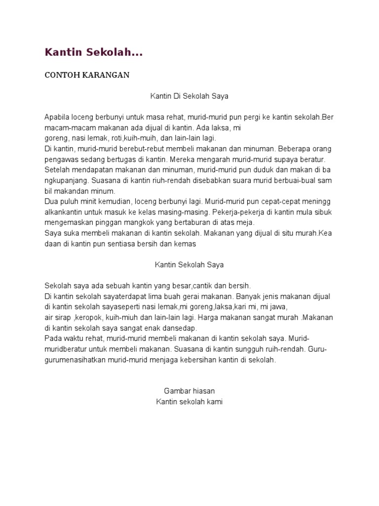 . Contoh Karangan Hari Kantin Sekolah Rendah Pada hari Jumaat yang lalu sekolahku iaitu Sekolah Rendah Kebangsaan Seri Indera telah mengadakan Hari Kantin peringkat sekolah. Contoh karangan surat rasmi spm 7 10 pm contoh karangan surat rasmi karangan spm spm kertas 1 bahagian b. Contoh Karangan UPSR Tulis sebuah karangan yang bertajuk Suasana Di Kantin Sekolah Saya Pada Waktu Rehat.
